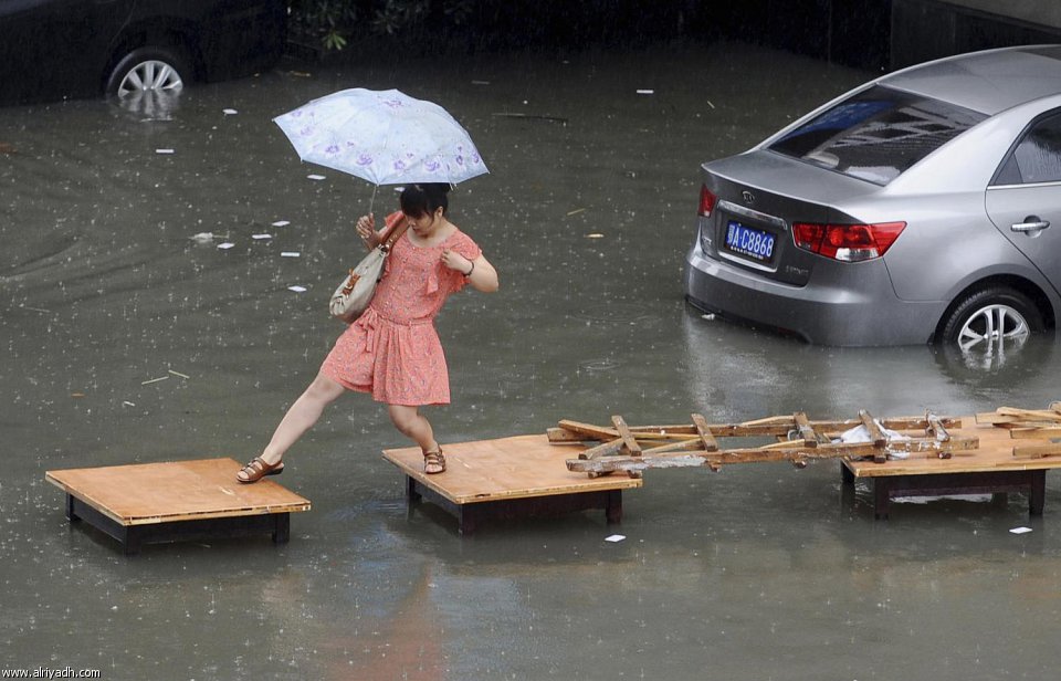 إمرأة تحمل مظلة تعبر أحد الشوارع المغمورة بمياة الامطار بمدينة ووهان - الصين