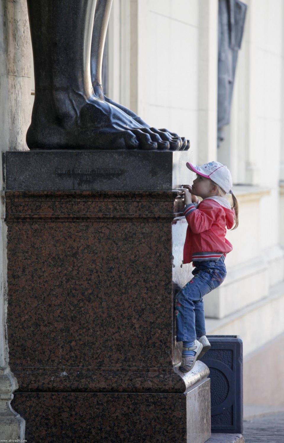 طفل يلعب في منحوتات الأطالس الشهيرة في متحف الأرميتاج في سان بطرسبرج - روسيا