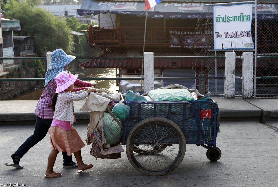 فتاتان تدفعان عربة محملة بمواد خلال عبورهما من جسر جمرك يربط ميانمار وتايلند - ميانمار