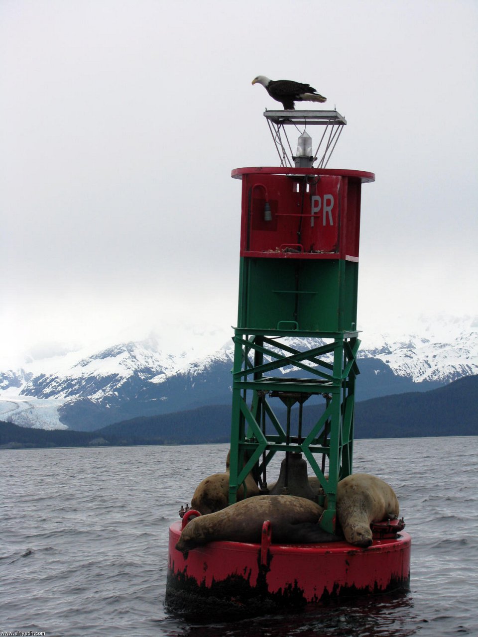 عدد من اسود البحر برفقة النسر الاصلع يسترحون على احد العوامات بالقرب من خليج اوكي - الاسكا