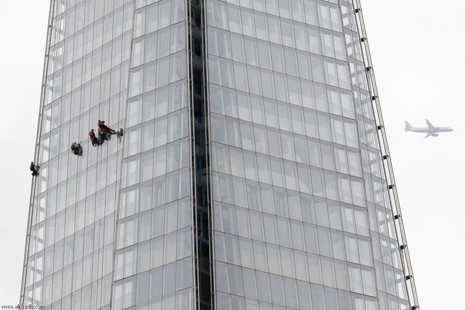 عمال يعملون خارج اطول مبنى في اوربا ( ذا شارد ) في لندن - بريطانيا