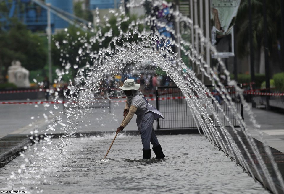 عامل يقوم بتنظيف نافورة خارج احد المجمعات التجارية في بانكوك - تايلاند